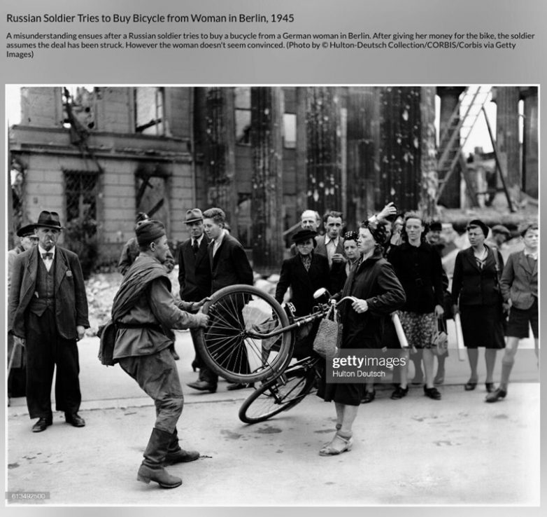 Кадр из архива Hulton Deutsch снят неизвестным западным фотографом и уже в конце августа 1945 года появился в американском журнале Time. Он сопровождался якобы ироничной подписью о том, что «солдат Красной армии пытается освободить велосипед берлинской фройляйн, но немка настаивает на своем праве собственности». Потом в журнале National Geographic написали: «Иван хочет велосипед, но Анна сказала: «Найн!». Конфликт представлен недоразумением. Мол, русский солдат хочет купить велик, а немка его не понимает и противится. «Русские в Берлине были сами не свои до приобретений» – насмешливо пишет журнал.