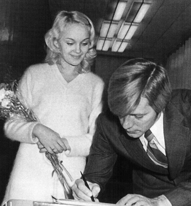 На этом фото мы с трудом узнаем Аллу Пугачева — совсем еще юная она предстает в непривычном для нас образе. Певица выбрала элегантное платье лаконичного кроя и украсила волосы фатой и цветочным венком. Ярко и празднично!