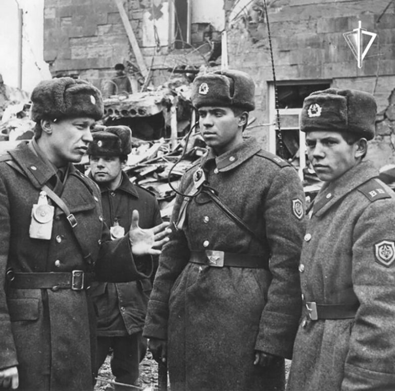 Военнослужащие внутренних войск МВД СССР обеспечивают охрану общественного порядка в зоне катастрофического землетрясения в Армянской ССР. Ленинакан, декабрь 1988 год