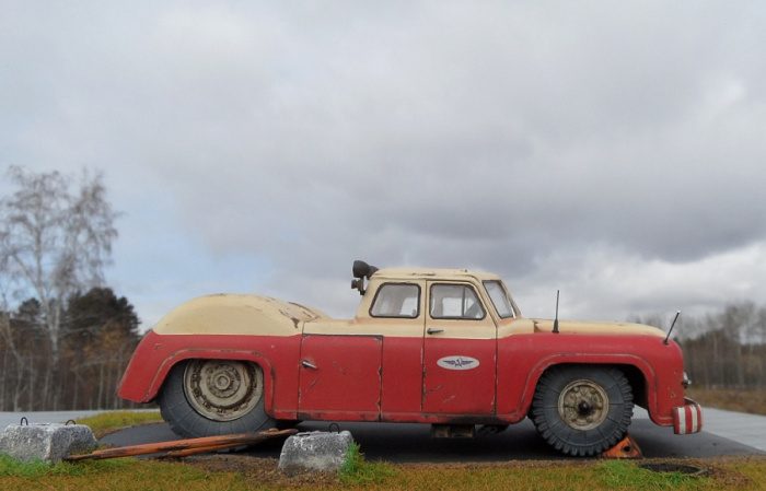 Собственно, «легковушка» МАЗ-541 только похожа на пикап. На самом деле это вовсе никакой не легковой автомобиль, а новый аэродромный тягач, созданный в 1956 году. Машина была специально спроектирована с учетом высоты шасси самолетов Ту-104. В отличие от армейских аналогов новинка могла подъезжать к самолету без риска зацепить фюзеляж. Это позволило значительно облегчить и ускорить процесс буксировки. Отличительной особенностью 541-го стало наличие двух постов управления – «переднего» и «заднего». «Задний» пост использовался оператором в момент зацепления самолета. «Передний» пост управления использовался водителем для движения по аэропорту, в том числе с буксируемым лайнером на хвосте.