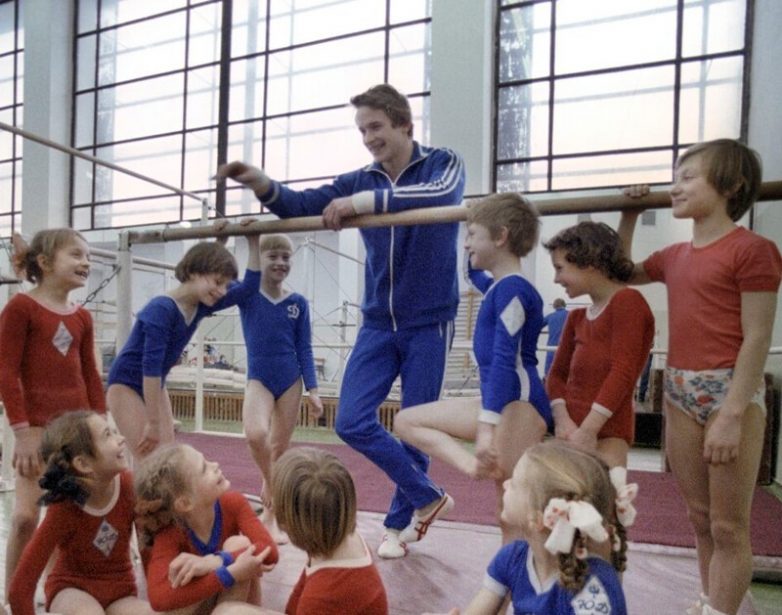 Советский гимнаст Александр Дитятин беседует с юными спортсменами, 1980 год