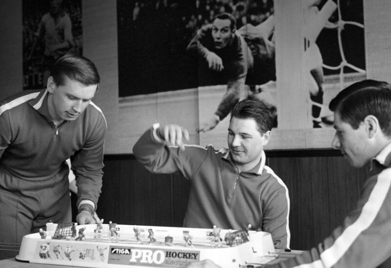 Владимир Лутченко, Игорь Ромишевский и Валерий Харламов играют в настольный хоккей, 1969 год