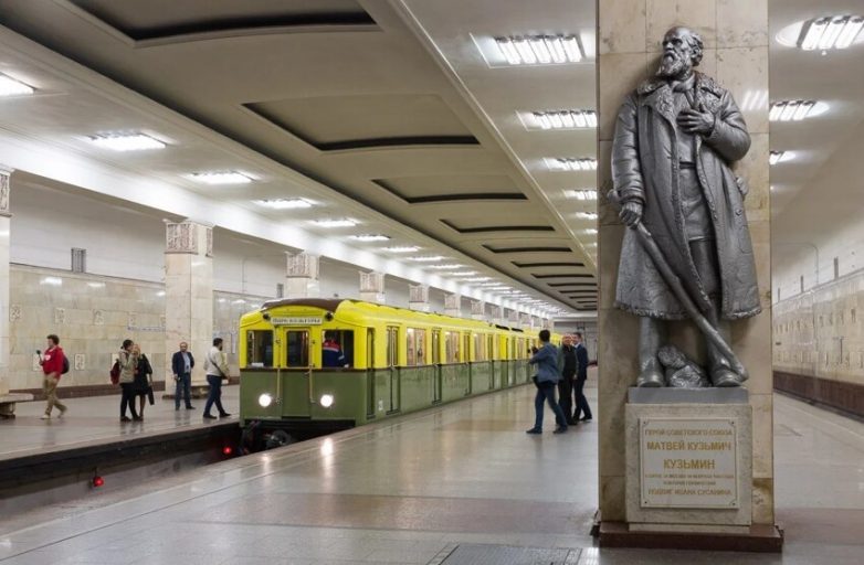 Он стилизован под поезда типа “А” — самые первые, которые начали ходить по Сокольнической линии в 1930-х.