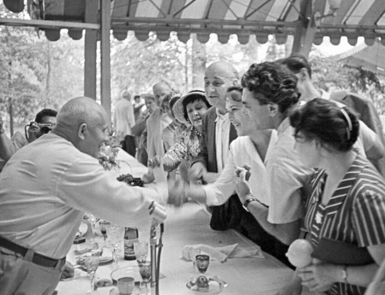 Никита Хрущев во время встречи на госдаче в Подмосковье с деятелями советской культуры и искусства, среди которых актриса Нонна Мордюкова и кинорежиссер Сергей Бондарчук, 1960 год