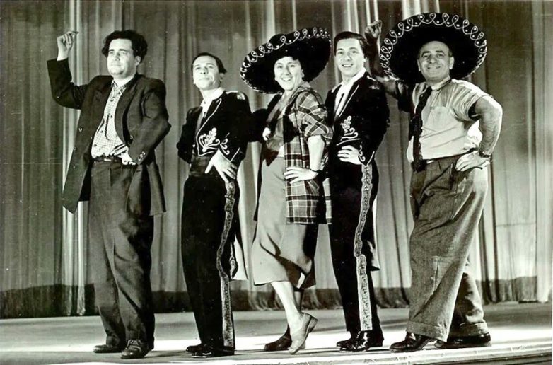 На фото: Э.Рязанов, чечеточники братья Гусаковы, оператор А.Кольцатый.