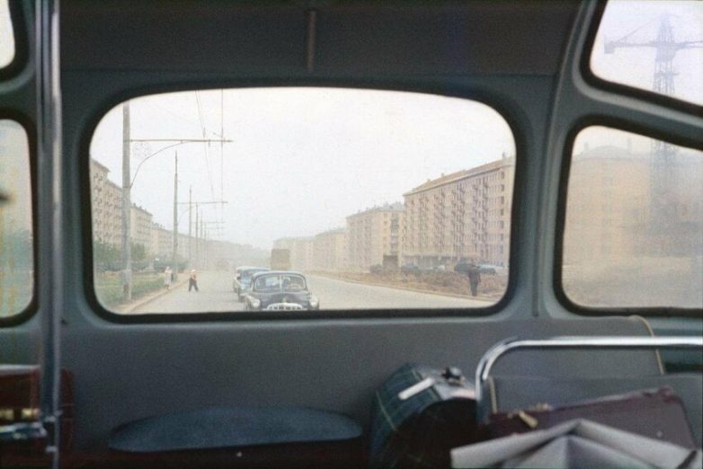 Вид из заднего окна автобуса на свеженькую застройку Ленинского проспекта. Ближайший справа — дом номер 85.