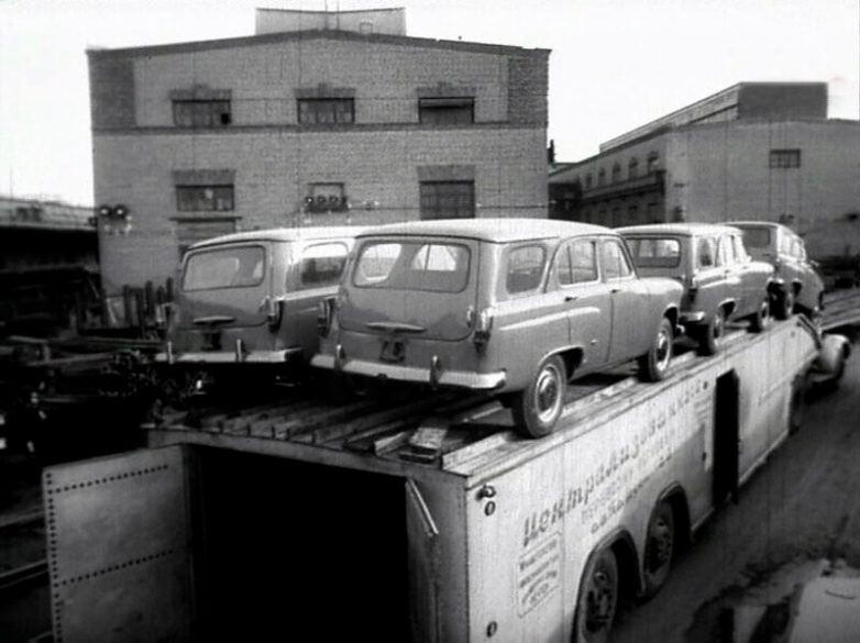 Автопоезд А-820 перевозит плотненько напиханные универсалы «Москвич-423» где-то в районе Южного порта.