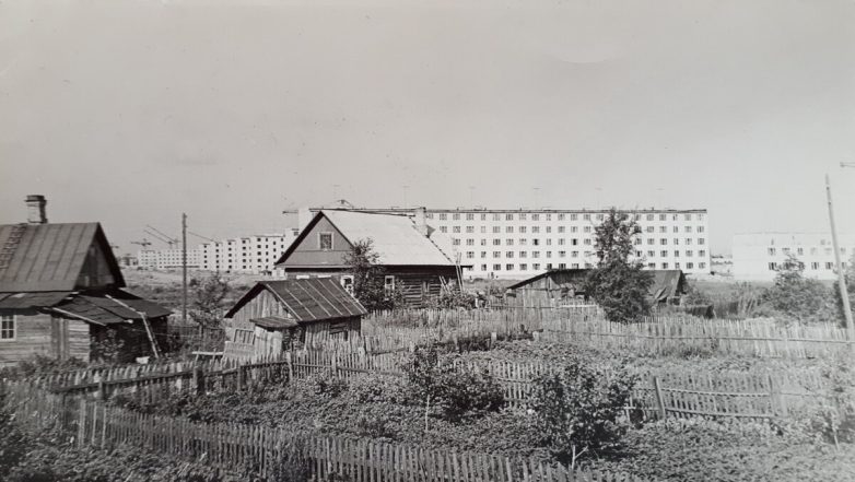 Вид от станции Нева на застройку Народной улицы. Снимок сделан ровно с того места, где сейчас находится путепровод, соединяющий Народную улицу и Мурманское шоссе. На месте дома со светлой крышей сейчас стоит АЗС «Татнефть».
