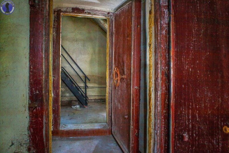 А здесь видна выныривающая из земли потерна, заходящая в здание штаба. К сожалению внутри штаба на момент визита были лишь голые стены.