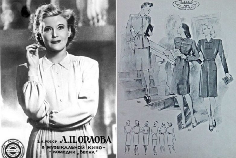 Открытка фильма «Весна» и издание Московского Дома Моделей — фасоны, чем-то напоминающие по силуэту наряд Любови Орловой.