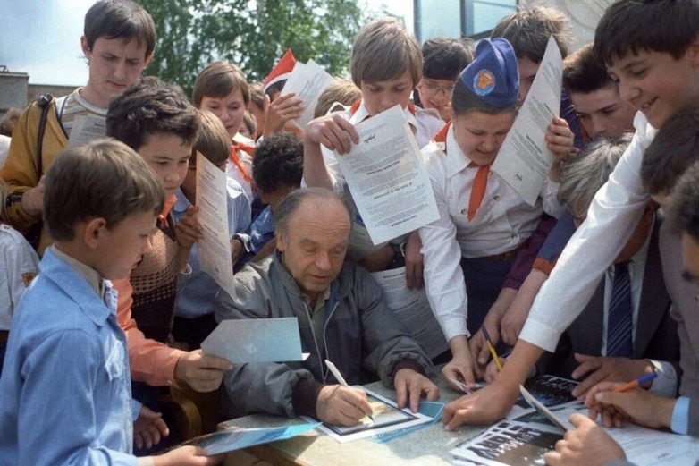 Владимир Шаинский раздает автографы юным почитателям, 1985 год
