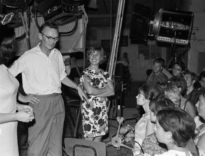 Леонид Гайдай среди советских и чехословацких студентов-гостей студии «Мосфильм», 1968 год
