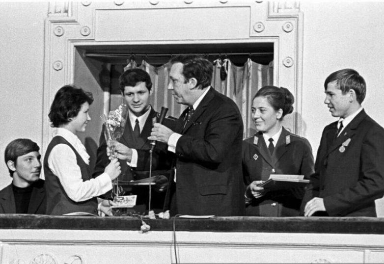Юрий Никулин вручает паспорта московским школьникам, 1973 год