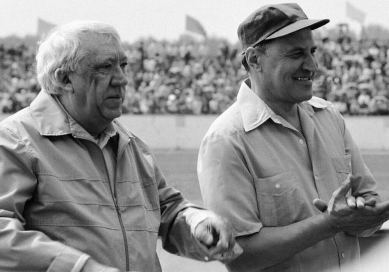 Юрий Никулин и Михаил Шуйдин играют в нарды в перерыве между выступлениями, 1972 год