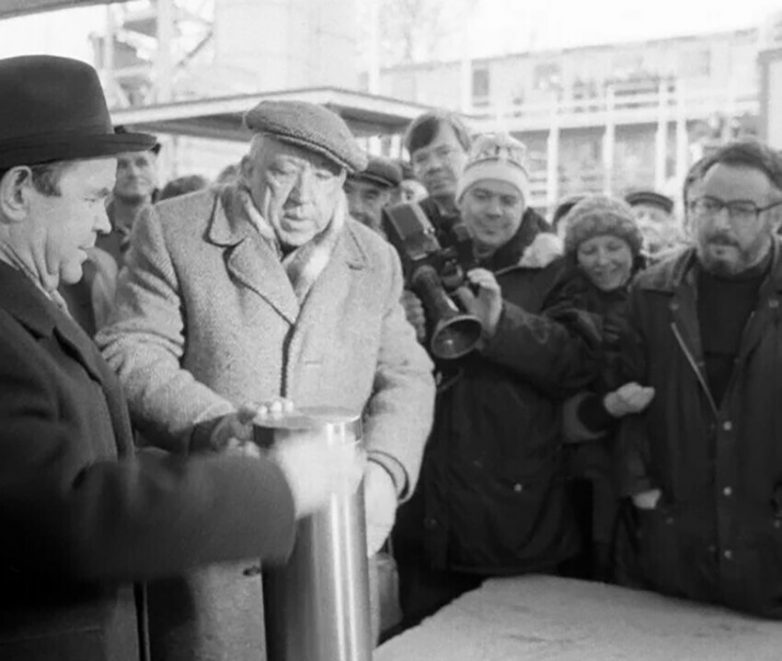 Юрий Никулин на закладке памятной капсулы в первый камень нового здания цирка, 1987 год