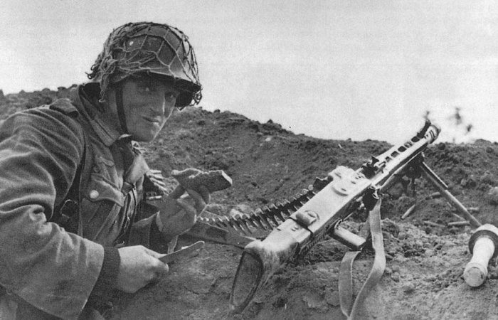 Еще до начала Второй мировой войны немцы смогли предложить, пожалуй, самую удачную конструкцию единого пулемета, который может выступать в качестве ручного, станкового и танкового — MG-34. Знаменитый MG-42 был сделан уже в годы войны именно на базе 34-го. Новый пулемет не был принципиально новым оружием, а по сути являлся результатом технического упрощения 34-го. Пойти на них пришлось из-за того, что война на восточном фронте затянулась, а вермахт стал нести ощутимые потери. Однако, несмотря на «упрощения» по своим основным характеристикам «пила Гитлера» ничем не уступала оригиналу. Этот пулемет был абсолютно страшным оружием с дальностью стрельбы более 1 км и темпом ведения огня до 1 200 выстрелов в минуту.