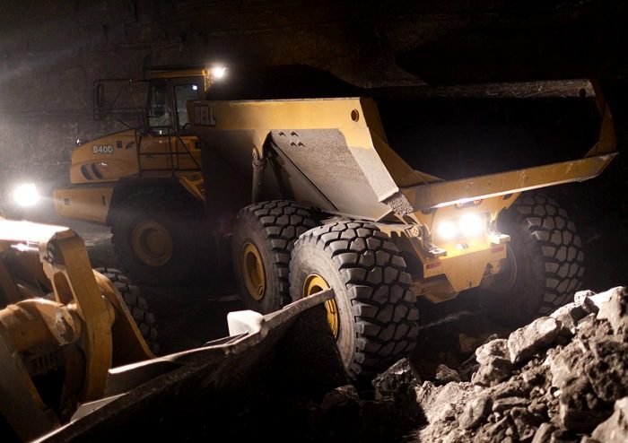 Огромные самосвалы свободно передвигаются под землёй.