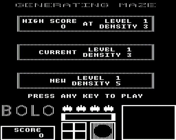 Аркадная игра по мотивам одноимённого научно-фантастического цикла Кита Лаумера, порт игры для Apple II. Игрок должен, управляя танком, уничтожить шесть вражеских баз. Они разбросаны по лабиринту, который при каждом запуске генерируется заново. При этом важно не попасть под огонь танков врага, не столкнуться с препятствиями и не израсходовать всё топливо. В Bolo было очень весело играть вдвоём, особенно если у вас были пульты с поворотными рукоятками: один управлял движением танка, а другой отстреливался от врагов. Игроки, воспитанные на советском патриотическом кино, воображали себя пулемётчиками на тачанке.