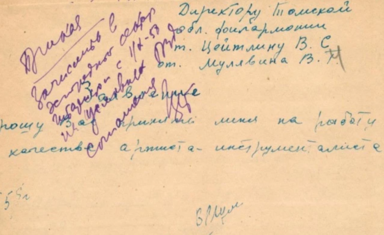 Из приказа: «Зачислить тов. Мулявина Владимира Георгиевича в эстрадный сектор гитаристом с 1 октября 1958 года на условиях трудового соглашения. Директор Томской облфилармонии — В. Цейтлин».