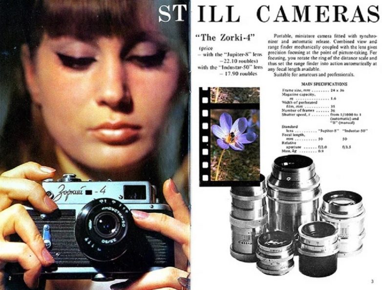 Самая массовая и технически совершенная модель среди фотоаппаратов «Зоркий». Аппарат экспортировался, что видно по другому подходу к рекламе.