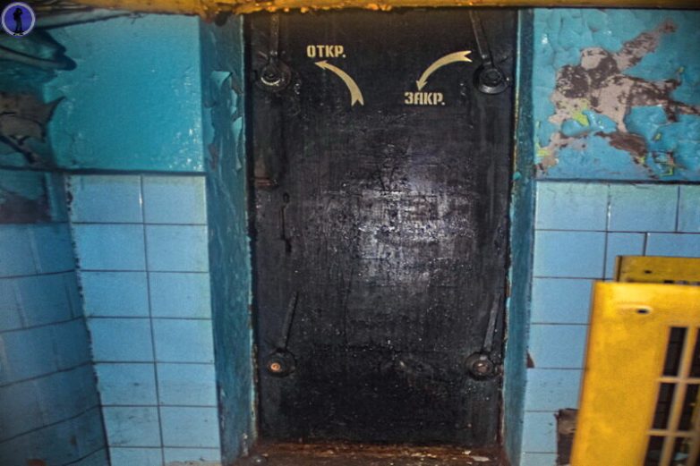 После спуска по одному из двух наклонных входов нас встречает тамбур-шлюз с двумя гермодверями.