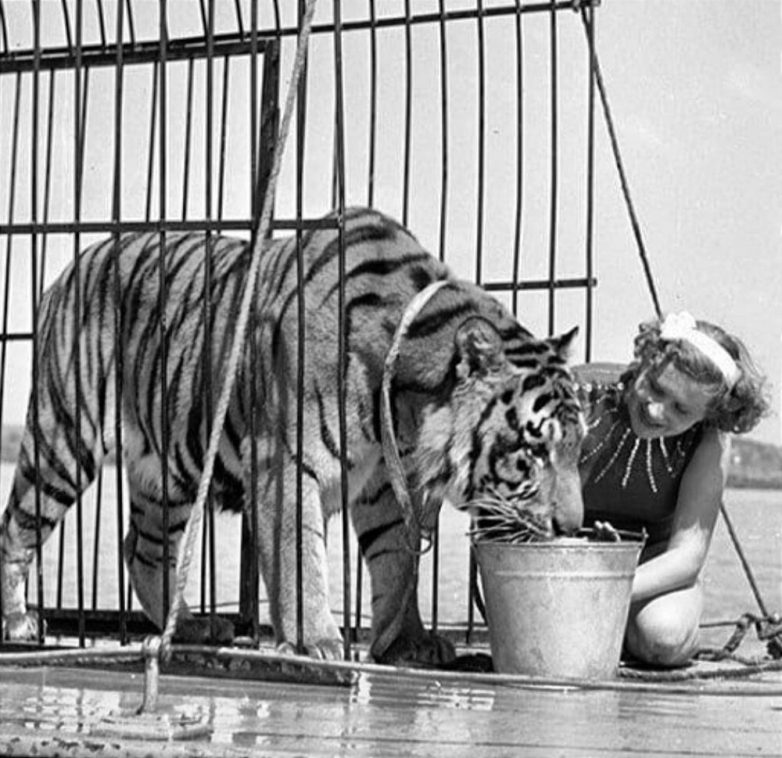 Укротительница Маргарита Назарова и тигр Пурш на палубе теплохода во время съёмок фильма «Полосатый рейс». 1956 год.
