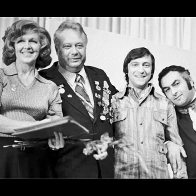 Валентина Леонтьева, спортивный комментатор Николай Озеров и артисты эстрады Геннадий Хазанов и Левон Оганезов. 6 сентября 1972 года.