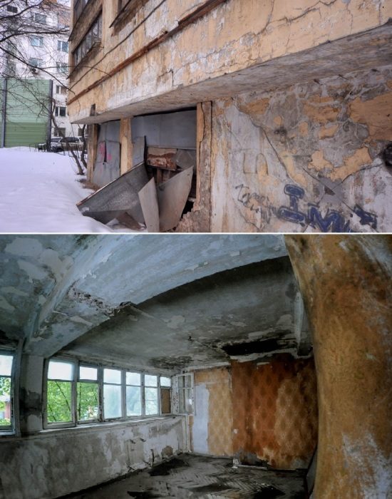 Дешевые строительные материалы очень быстро начали терять привлекательность и целостность, что привело к обветшанию жилого комплекса (Дома Наркомфина, Москва).