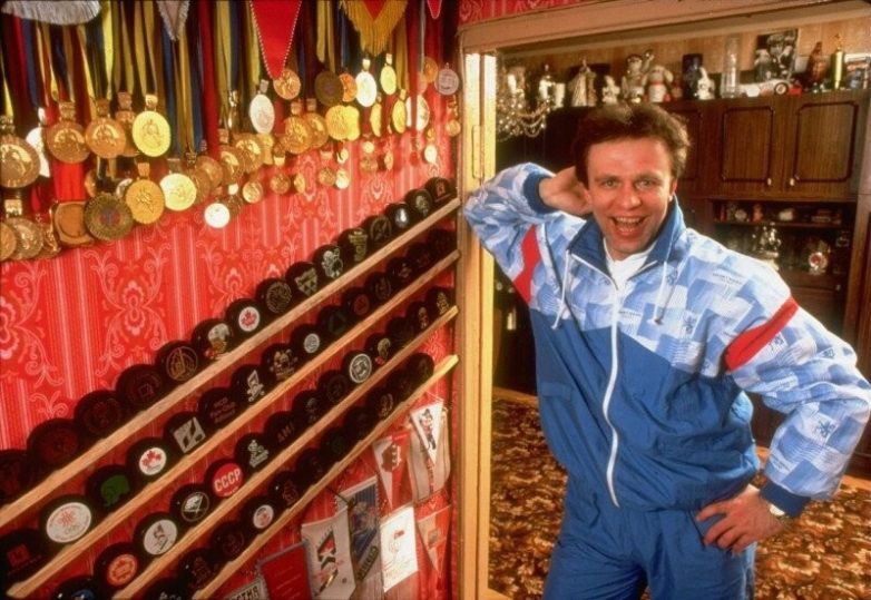 Советский хоккеист Вячеслав Фетисов позирует на фоне своих медалей и трофеев, 1980-е