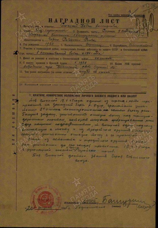 Из наградного листа Павла Антифеевича Смешного: «Тов. Смешной 17.04.45 года одним из первых в роте переправился на западный берег р. Одер. Гранатами уничтожил две огневые точки противника, …огнем из автомата и трофейного оружия в этом бою уничтожил до 100 солдат противника, …в рукопашной схватке с врагом геройски погиб…».