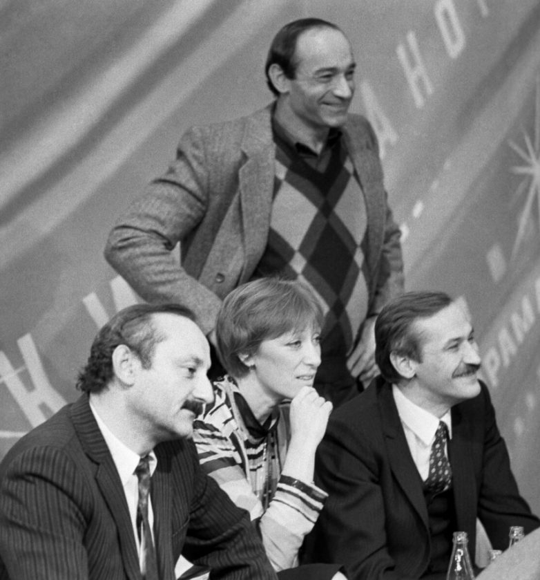 Семен Фарада, Екатерина Васильева, Валентин Гафт и Леонид Филатов во время записи передачи «Кинопанорама», 1982 год