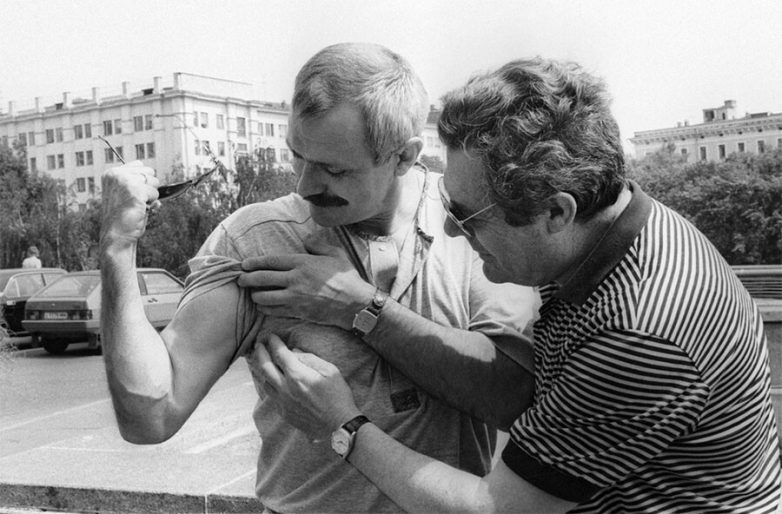 Спартак Мишулин и московский школьник Антон Ребриков на съемках фильма «К вопросу о скромности». 1 августа 1979 года.