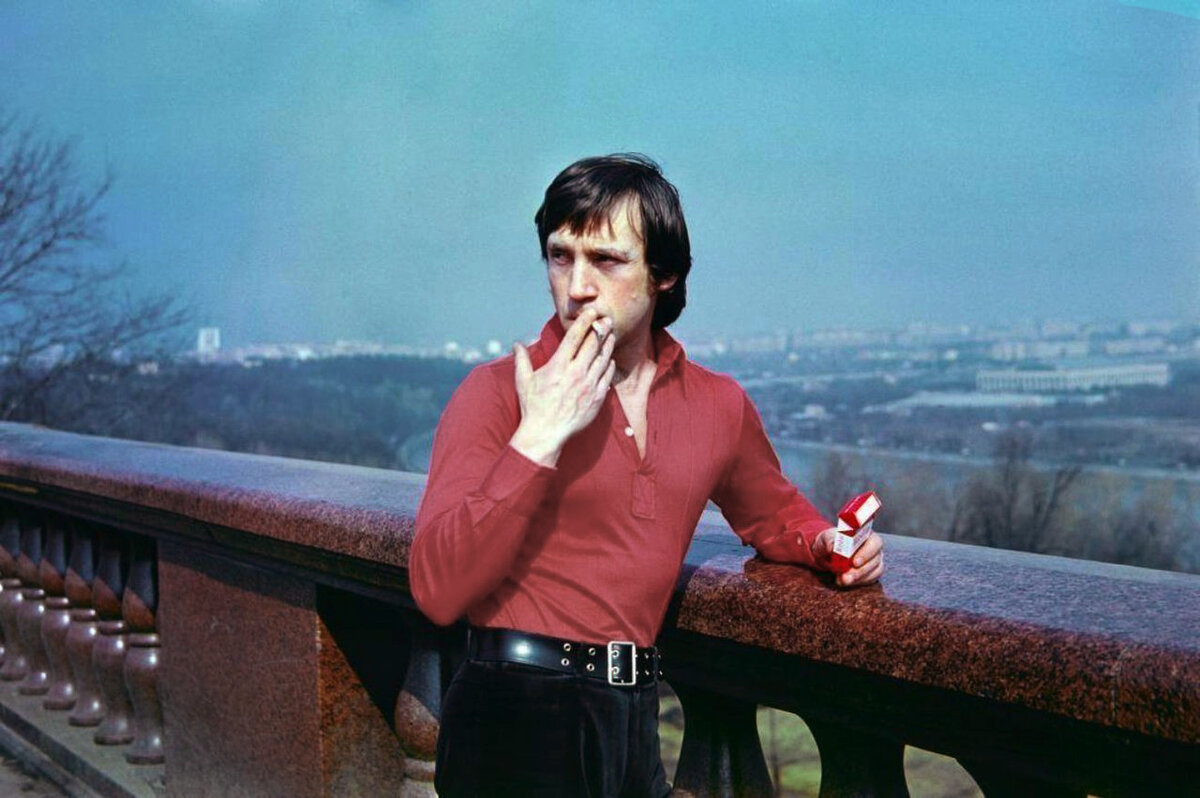 Владимир Высоцкий позирует на фоне Ленинских (ныне — Воробьёвы) гор.
