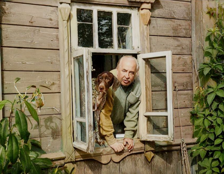 Кинорежиссёр Лев Кулешов со своим четвероногим другом на даче, 1958 год