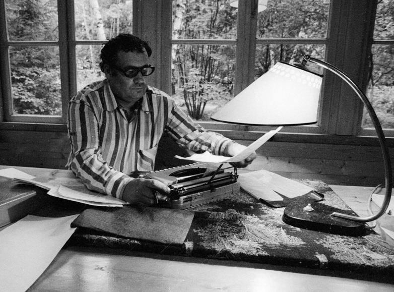 Кинорежиссер Эльдар Рязанов за рабочим столом на даче, 1978 год
