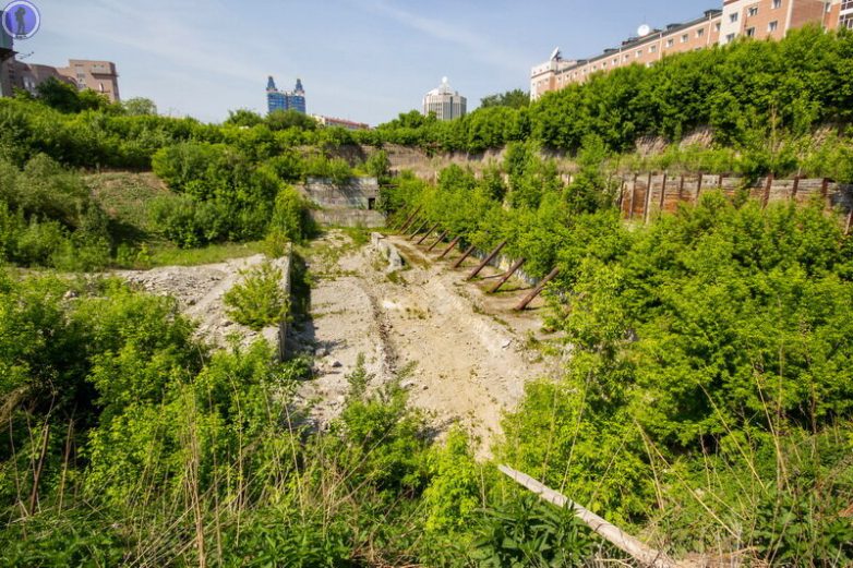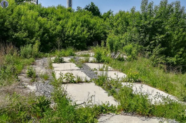 С тех пор эта огороженная и забытая площадка с огромным котлованом постепенно зарастает деревьями.