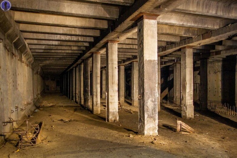 Спустившись в который мы оказываемся в таком большом зале с колоннами, в котором должна была располагаться мощная фильтро-вентиляционная установка на огромное количество фильтров.