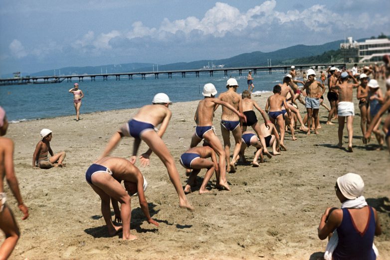 Утренняя зарядка на берегу Черного моря в лагере «Артек», 1985 год