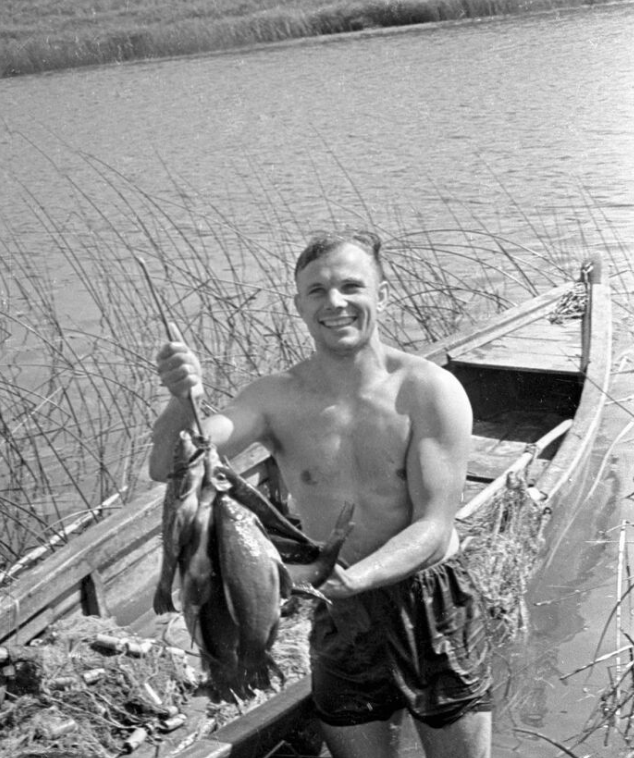 Летчик-космонавт Юрий Гагарин с уловом на реке Угре в окрестностях Гжатска, 1961 год