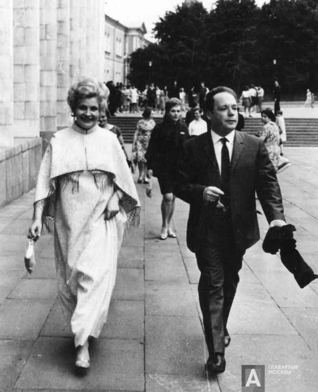 Актриса Татьяна Доронина и драматург Эдвард Радзинский перед входом в здание Кремлёвского дворца съездов во время проведения VI Московского международного кинофестиваля, 1969 год