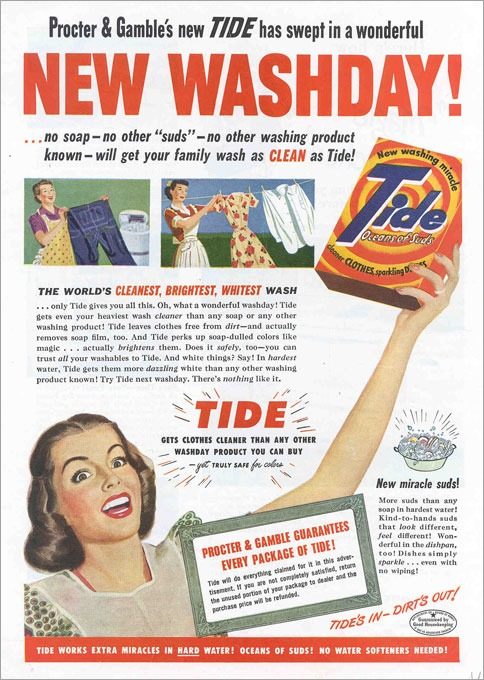 Это изобретение быстро разошлось не только по США, но и по всему миру. Причем за несколько лет до появления бытовых стиральных машин. Тогда же придумали рекламный слоган: «Океан пены», он просуществовал с 1949 по 1996 годы.