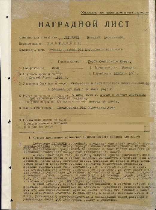 Наградной лист на Василия Дегтярёва.