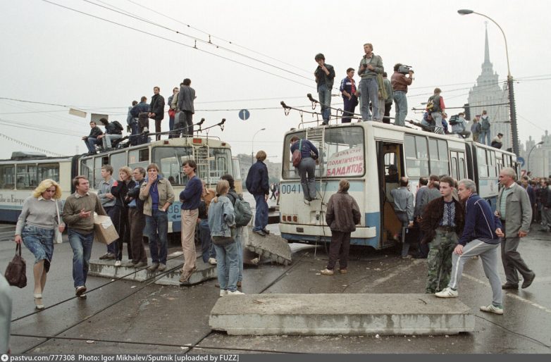 20 августа 1991 года. Москвичи сооружают заслон из троллейбусов на проспекте Калинина (ныне — улица Новый Арбат).