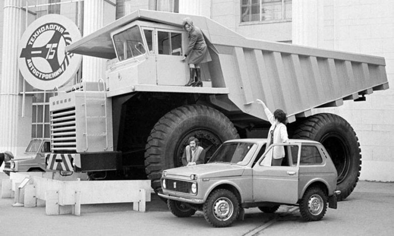 Прототип Нивы ВАЗ-2121М и карьерный самосвал БелАЗ, 1975 год