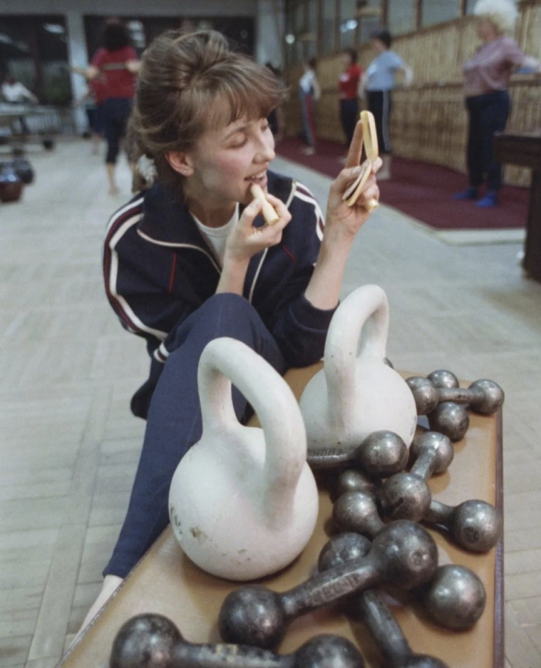 5. Студентка делает макияж в перерыве между упражнениями в секции атлетической гимнастики учебно-спортивного комплекса сельскохозяйственного техникума в Краснодаре, 1989 год