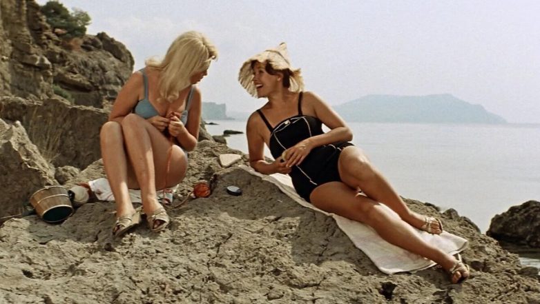 Для начала вспомним закрытые купальники актрис в знаменитой комедии «Три плюс два». Кустинская и Фатеева прекрасно вписались в роль пляжных незнакомок, в которых герои фильма просто не могли не влюбиться. Несмотря на закрытые купальники, актрисы блестяще раскрыли свою естественную красоту, покорив сердца миллионов зрителей.