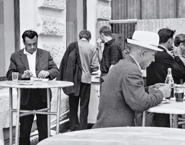 Никаких столиков и официантов в рюмочных не было. Посетители выстраивались в очередь, получали от буфетчицы нехитрые заказы, а затем шли к барным столикам.