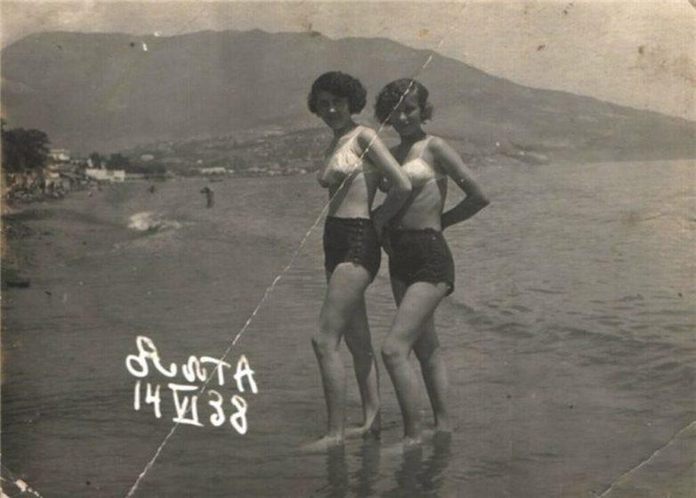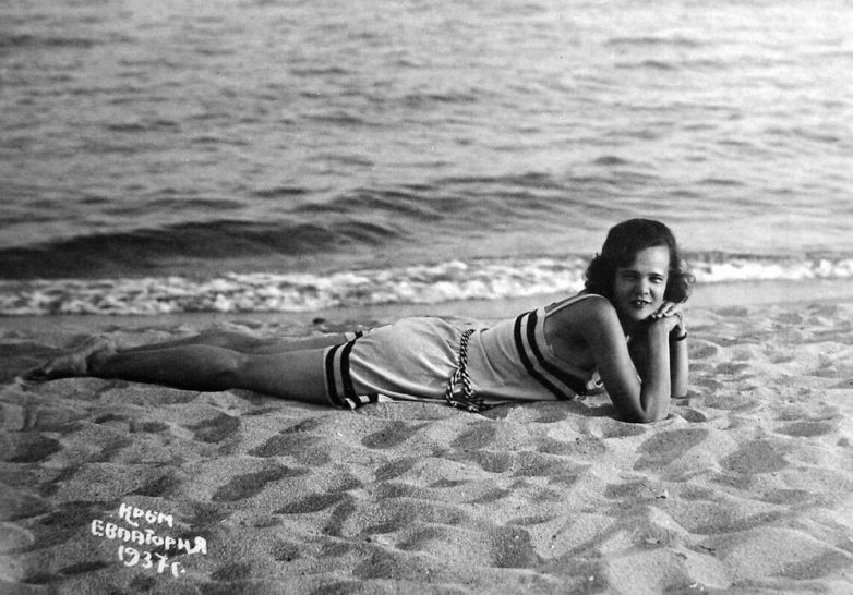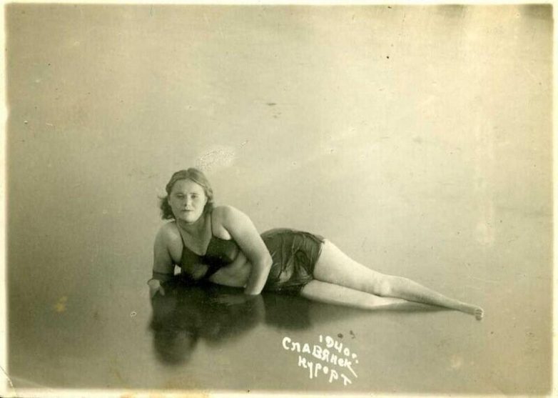 Закончим давайте вполне себе пуританским фото 1940 года, сделанном в Славянске. Моря там, конечно, нет, но зато есть лечебные соляные озёра, на базе которых в 1928 году был построен санаторий №8 имени 10-летия Октябрьской революции.