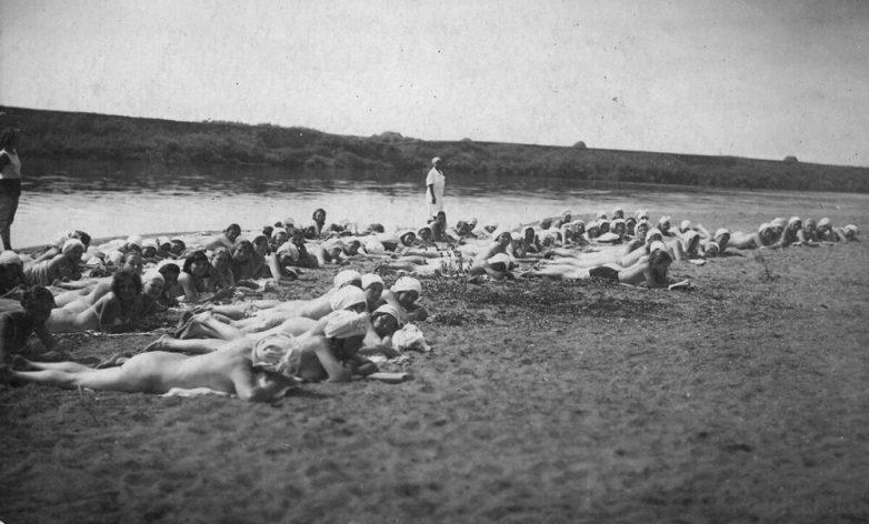 Ещё одно фото. Не в Крыму, а в Иваново! Работницы ивановской мануфактуры принимают солнечные ванны на берегу реки Уводь, поворачиваясь по команде медсестры, лето 1931 года. Мы видим на них белые косынки и, в принципе, всё.