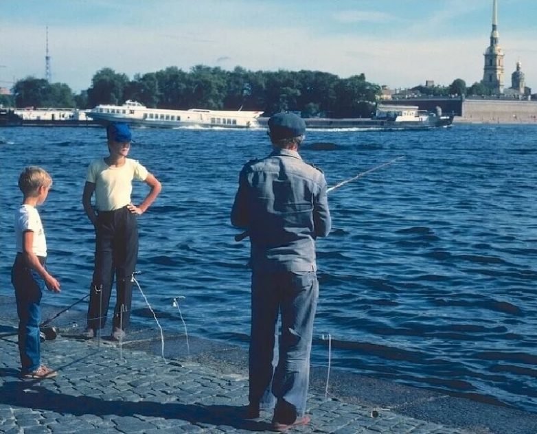 А это обычное лето в Ленинграде. Напротив Петропавловской крепости ловят рыбу.